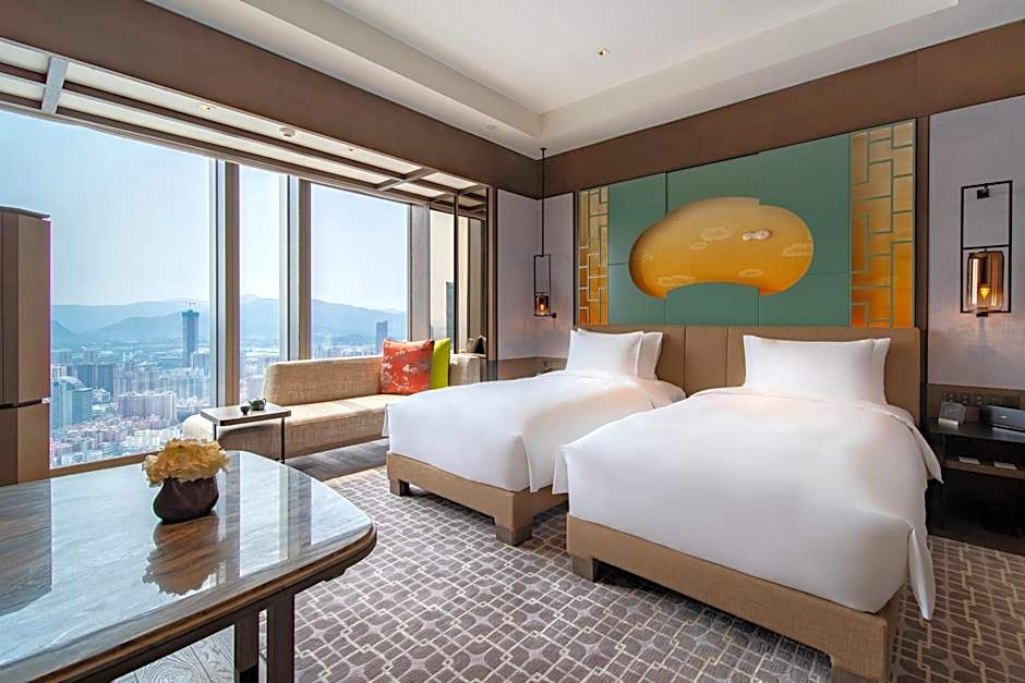48 sq m room fitted with floor-to-ceiling windows and panoramic views of the Shenzhen skyline, it features twin beds, distinct dressing zone separated by French sliding doors. The hotel guestrooms epitomize functional luxury, providing sophisticated residential comfort away from the demands of urban life. Enjoy complimentary soft drinks from the mini-bar on the first day of each stay;